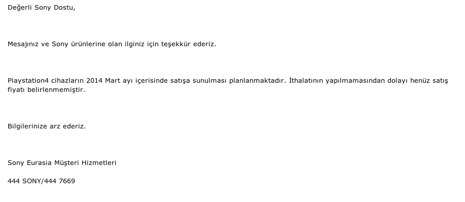 (Sony Eurasia (Turkish) reply my mail about my release date for PS4 in Turkey.)